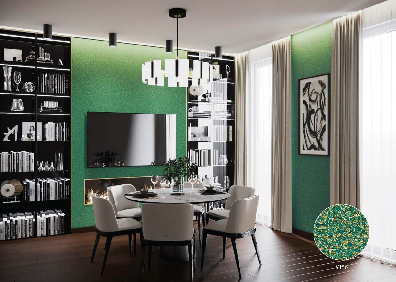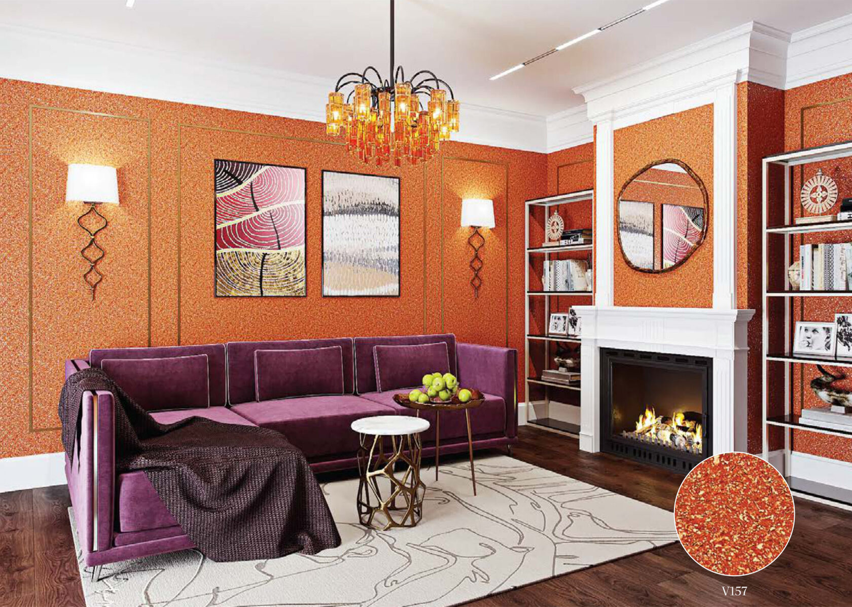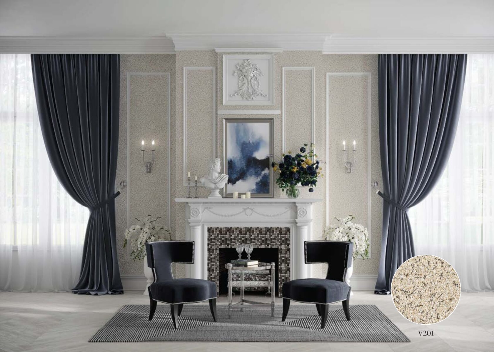 Шёлковая штукатурка коллекции Versailles великолепно сочетается с натуральным камнем, красным и черным деревом, тканевыми и натуральными обоями.