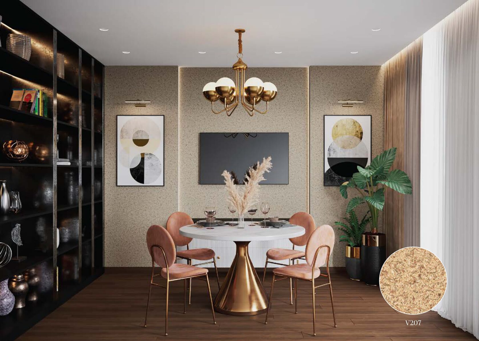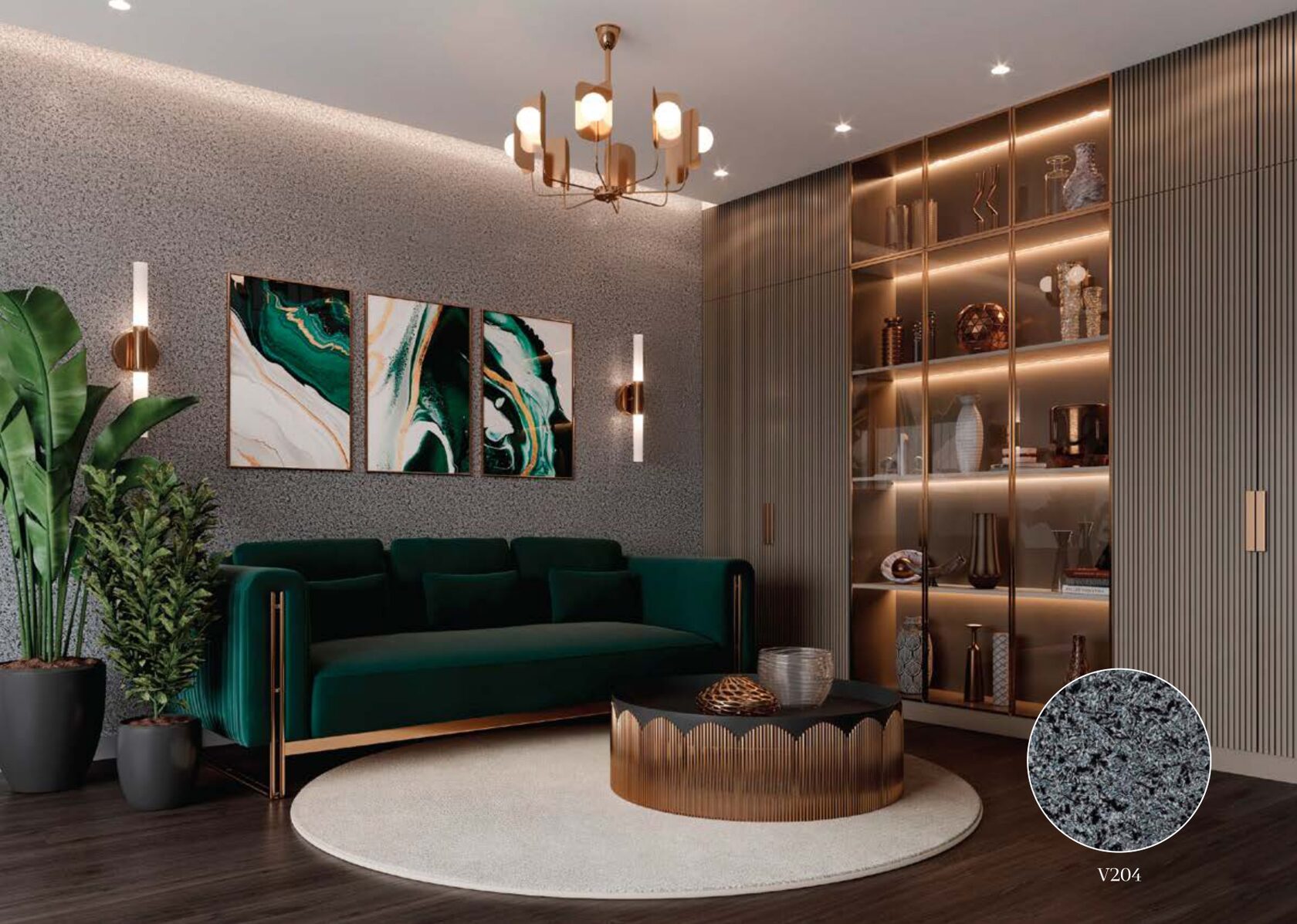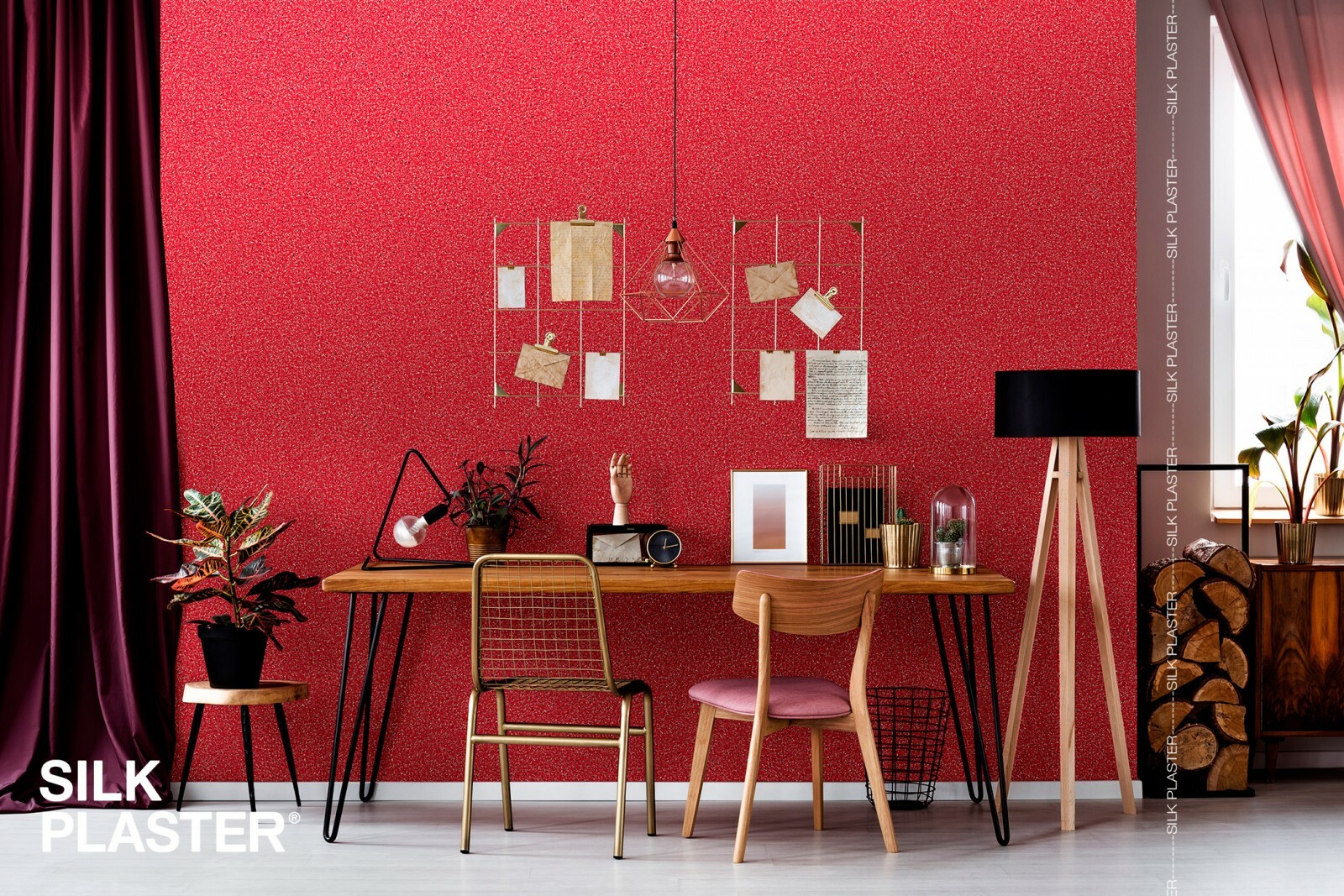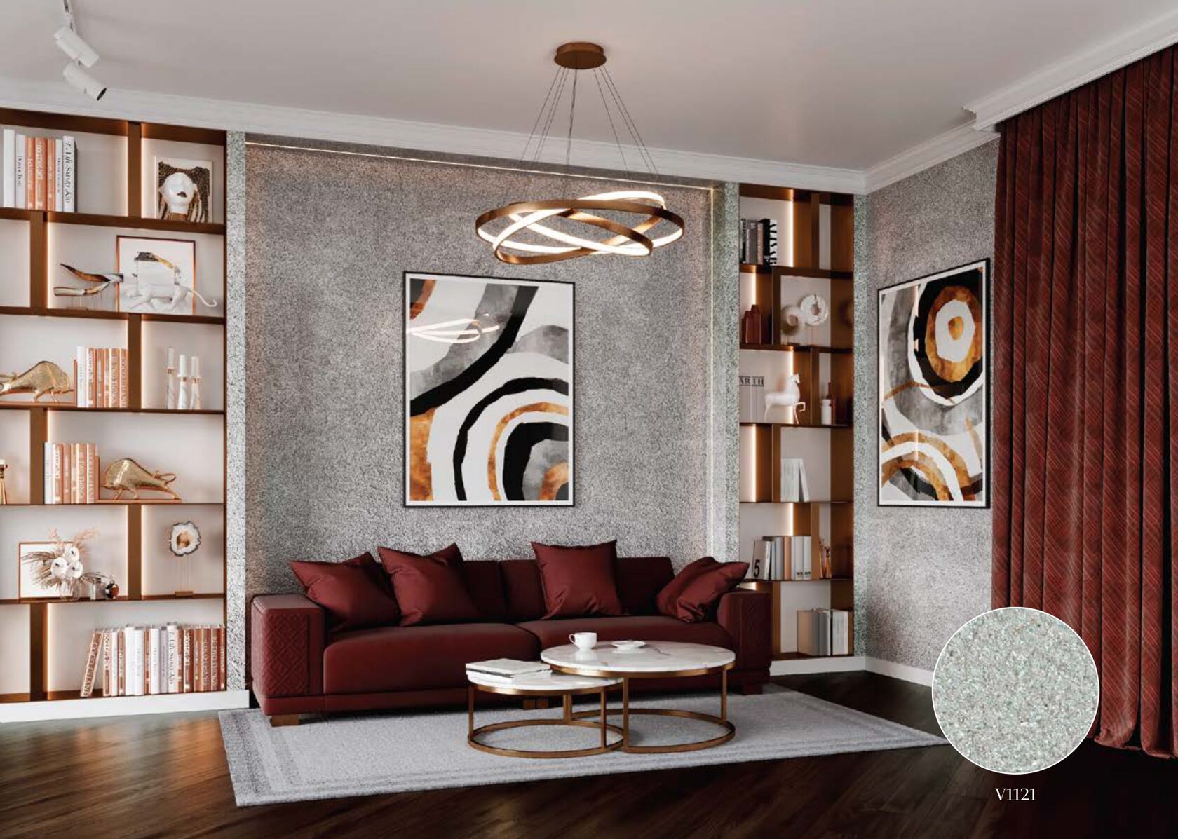Шёлковая штукатурка коллекции Versailles великолепно сочетается с натуральным камнем, красным и черным деревом, тканевыми и натуральными обоями.